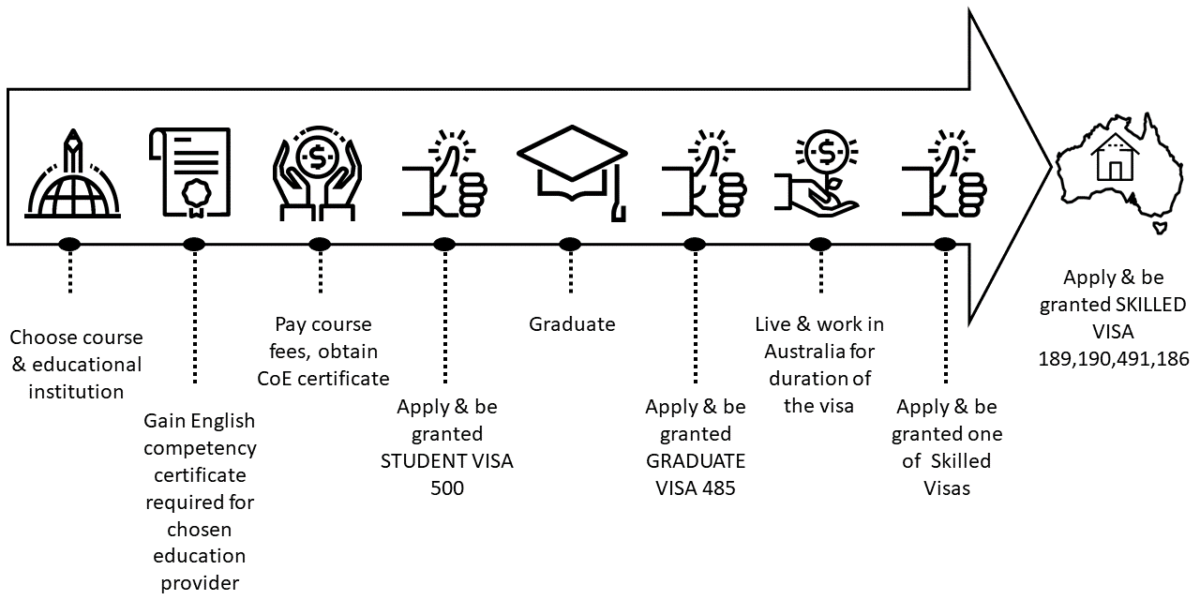 Đương đơn đang giữ hoặc đã giữ visa 500. Nếu visa 500 hết hiệu lực, đương đơn cần chứng minh đã hoàn thành các bằng cấp ở Úc trong 6 tháng gần nhất. Khóa học của đương đơn có độ dài ít nhất 2 năm. |