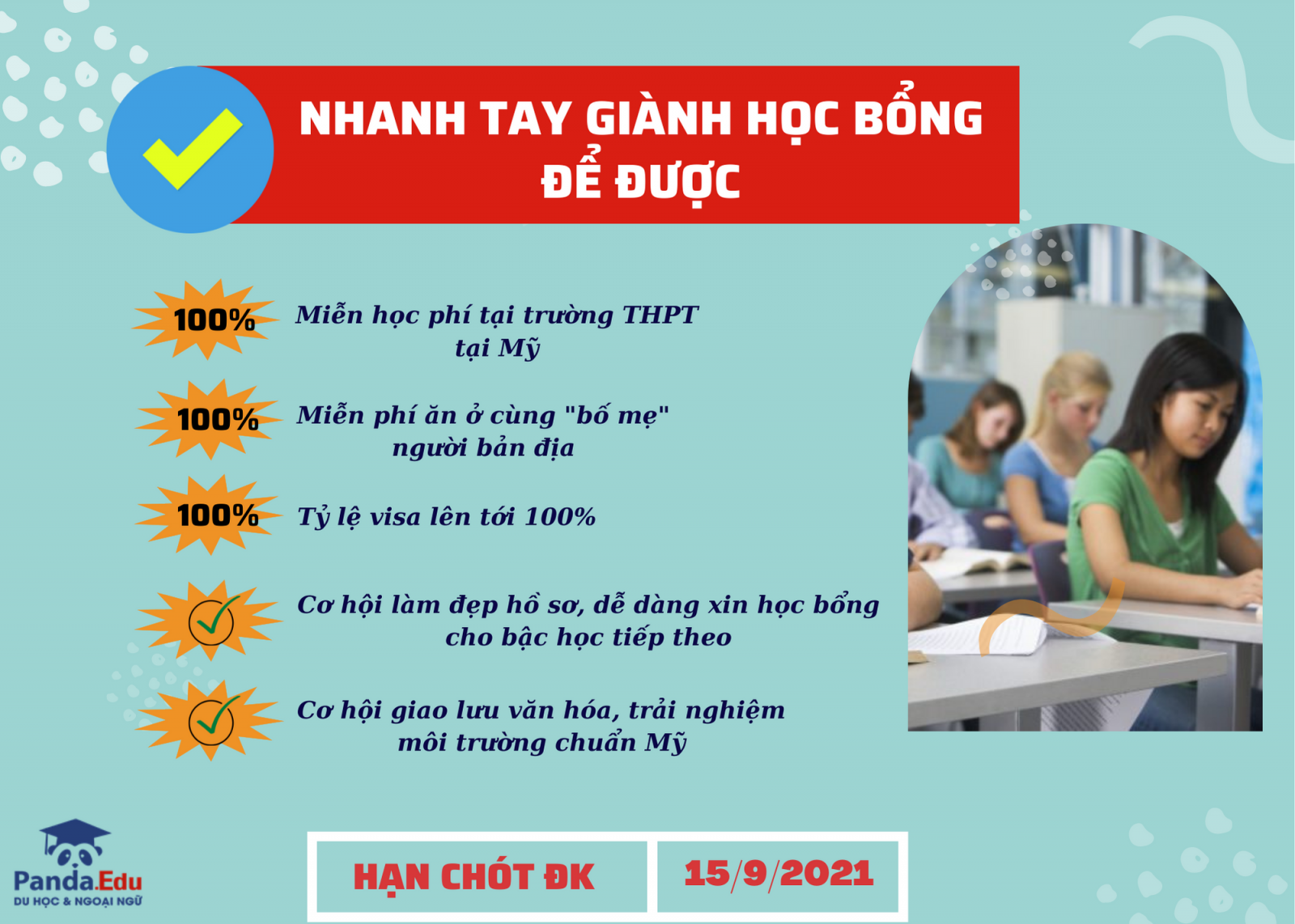 Cứ mỗi tháng 9-10 hàng năm là Panda rất vui vì có cơ hội trao đến các em học sinh THPT tại Việt Nam 20 suất học bổng toàn phần chính phủ Mỹ. Đây là cơ hội duy nhất chỉ có 1 lần được du học Mỹ bậc THPT hoàn toàn miễn phí Nối tiếp thành công của mùa thứ 7, các em đã sẵn sàng tham gia cuộc thi giành học bổng lần 8. Thể lệ chương trình năm nay hoàn toàn mới: Thi trực tuyến - Nhận học bổng trực tiếp này chưa nào!!!