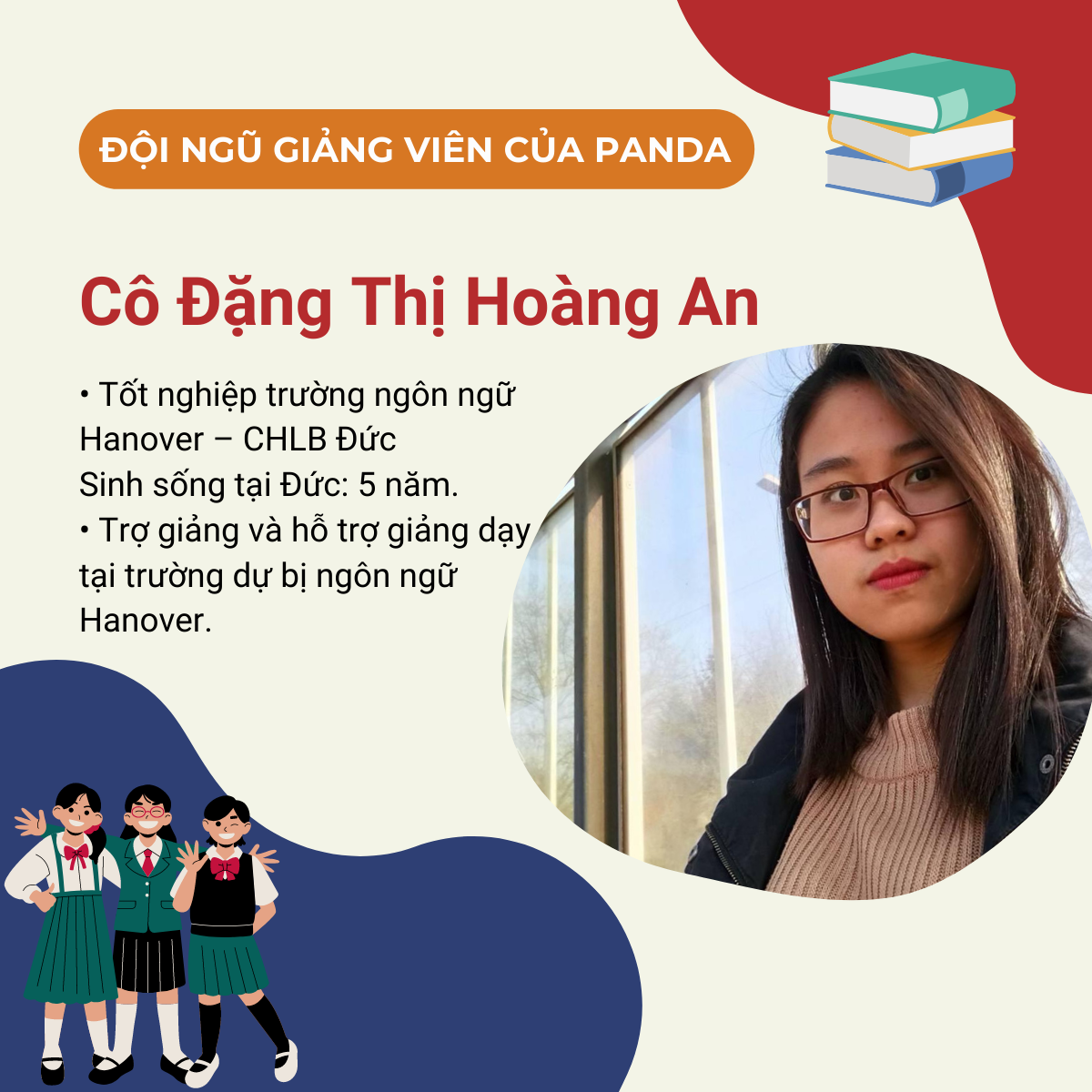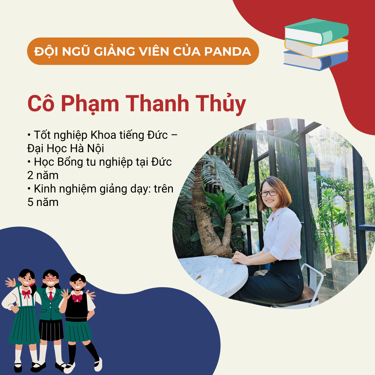 - Tốt nghiệp Khoa tiếng Đức - Đại học Hà Nội. Giảng viên có hơn 5 năm kinh nghiệm giảng dạy và ôn thi tiếng Đức A1-B1