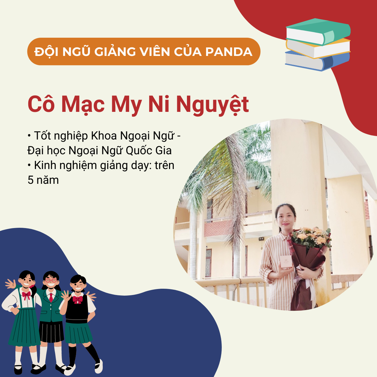 - Tốt nghiệp Đại học Ngoại Ngữ - Đại học Quốc gia Hà Nội.